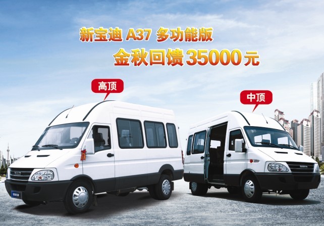 | | 新宝迪A37物流王 NJ6543 外型尺寸(长*宽*高)(mm) 5490*2000*2540 ,2790 内部尺寸(长*宽*高)(mm) 3345*1840*1690 ,1840 内部容积(m3) 10.4 ,11.32 座位数(人) 5-9 额定总质量(kg) 3550 最高车速(km/h) 130 最小离地间(mm) 165 最小爬坡度(%) 30 最小转弯直径(m) 10.7 功率(hp/rpm) 125/3600(国Ⅲ)